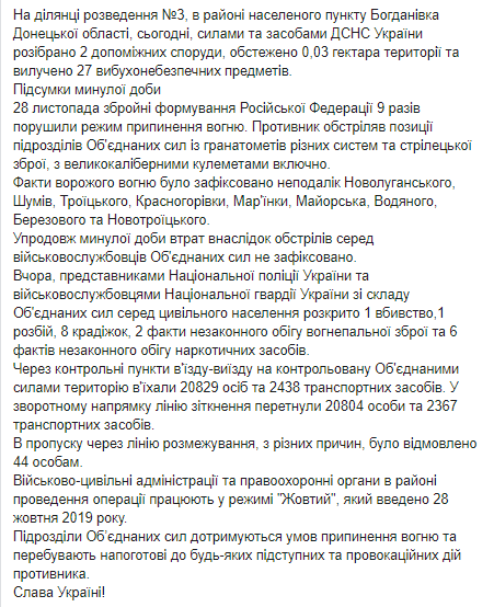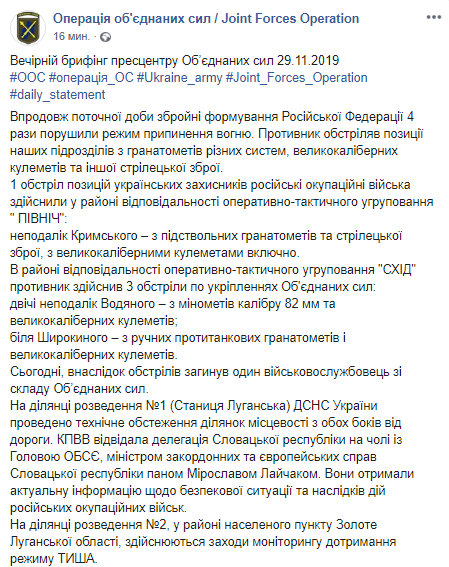 "Противник обстрелял позиции наших подразделений из гранатометов различных систем, крупнокалиберных пулеметов и другого стрелкового оружия… Сегодня, в результате обстрелов погиб один военнослужащий из состава Объединенных сил", - говорится в вечерней сводке, обнародованной на странице пресс-центра в соцсети Фейсбук.