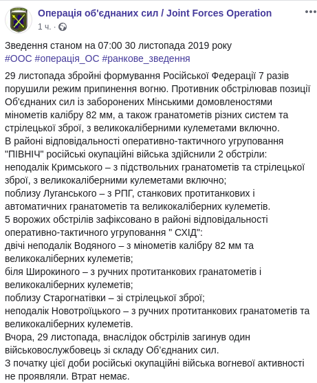 "Вчера, 29 ноября, в результате обстрелов погиб один военнослужащий из состава Объединенных сил.