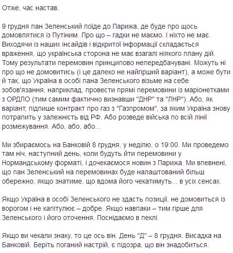 "Мы проведем там ночь, следующий день, когда будут идти переговоры в Нормандском формате, и дождемся новостей из Парижа. Мы уверены, что господин Зеленский на переговорах будет настроен более осторожно, если будет знать, что дома его будут ждать... во всех смыслах.  Если Украина в лице Зеленского не сдаст позиции, не договорится с врагом и не капитулирует – хорошо. Если наоборот – тем хуже для Зеленского и его окружения. Позавтракаем в аду. Если вы ждали знака, то вот он. День "Д" – 8 декабря. Высадка на Банковой. Берите плохое настроение, есть подозрение, что он понадобится", - уточняется в обращении.