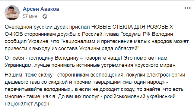 "Очередной русский дурак прислал новые стекла для розовых очков сторонникам дружбы с Россией: глава Госдумы РФ Володин сообщил Украине, что "национализм и притеснение малых народов может привести к выходу из состава Украины ряда областей". От себя - господину Володину:  говорите чаще! Это помогает нам, украинцам, лучше понимать истинные устремления "русского мира", - написал Аваков.