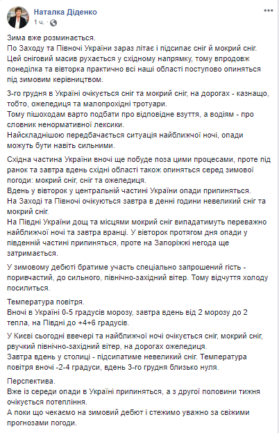 По словам Натальи Диденко, до восточной части Украины в ночь на вторник снегопады не доберутся, однако под утро и 3 декабря днем на ​​восток также придет мокрый снег, снег и гололедица.