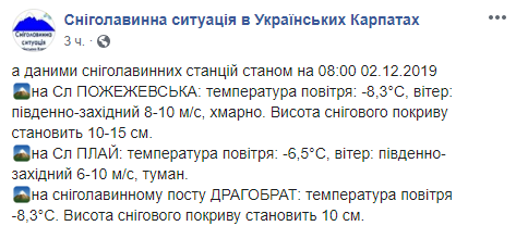 "На Сл Пожежевская: температура воздуха: -8,3°С, ветер: северный 8-10 м/с, облачно. Высота снежного покрова составляет 10-15 см. На Сл Плай: температура воздуха: -6,5°С, ветер: северный 6-10 м/с, туман. На снеголавинном посту Драгобрат: температура воздуха -8,3°С. Высота снежного покрова составляет 10 см", - говорится в сообщении.