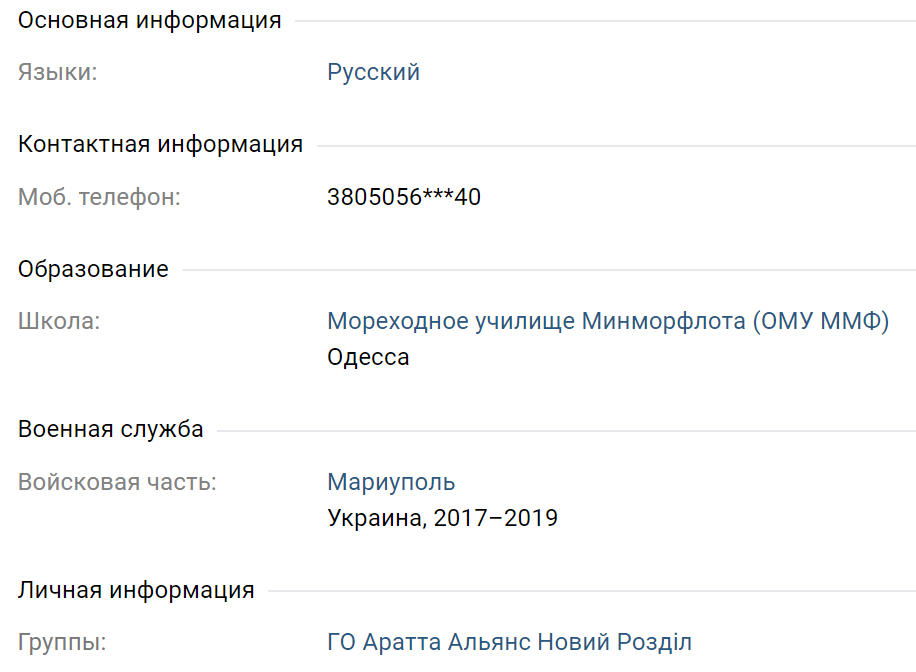 А вот у Семенова аккаунт "ВКонтакте" гораздо более открытый. Он указывает, что учился в одесском мореходном училище. Язык общения - русский. Годы воинской службы - с 2017 по 2019. Город службы указан Мариуполь, а подразделение - "Аратта" (ранее находилось в "Правом секторе").