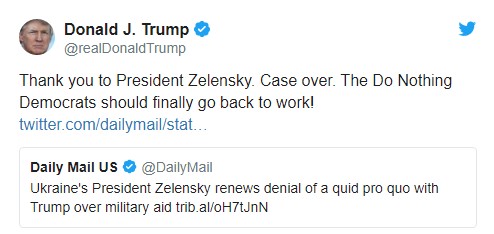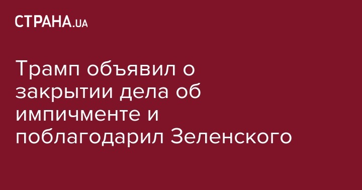 Спасибо президенту Зеленскому. Дело (об импичменте, – Ред.) закрыто. Ничего не делающие демократы должны наконец вернуться к работе!".