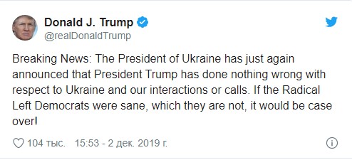 "Срочные новости: президент Украины только что вновь объявил, что президент Трамп не сделал ничего плохого в отношении Украины или нашего взаимодействия и звонков. Если бы радикальные левые демократы были в здравом уме, а это не так, дело (об импичменте, – Ред.) было бы закрыто!