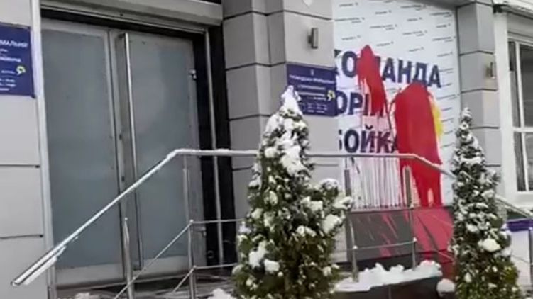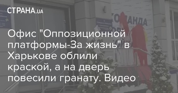 В Харькове неизвестные облили красной краской офис украинской партии "Оппозиционная платформа - За жизнь" и примотали скотчем к входной двери здания гранату.