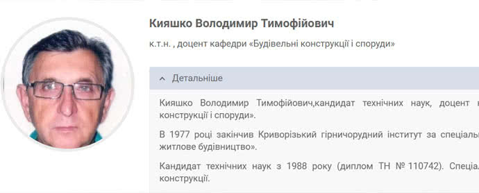 Кияшко является кандидатом технических наук, доцентом кафедры "Строительные конструкции и сооружения" Киевского института железнодорожного транспорта, преподает дисциплину "Строительные конструкции и сооружения на транспорте".