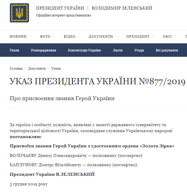 "За героизм и личное мужество, проявленные в защите государственного суверенитета и территориальной целостности Украины, самоотверженное служение Украинскому народу постановляю: Присвоить звание Герой Украины с вручением ордена "Золотая Звезда" Волочаеву Денису Александровичу - полковнику (посмертно); Каплунову Дмитрию Витальевичу - полковнику (посмертно)", - говорится в тексте указа №877/2019.