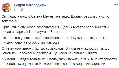 Министр обороны Андрей Загороднюк изучает ситуацию о неаттестации подполковника, боевого генерала, Героя Украины Евгения Межевикина (позывной Адам) и назначил служебное расследование для выяснения обстоятельств инцидента. Об этом он сообщил на своей странице в Facebook.