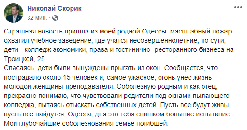Спасаясь, дети были вынуждены прыгать из окон. Сообщается, что пострадало около 15 человек и, самое ужасное, огонь унес жизнь молодой женщины-преподавателя. Соболезную родным и как отец, прекрасно понимаю, что чувствовали родители под окнами пылающего колледжа, пытаясь отыскать собственных детей. Пусть все будут живы, пусть все найдутся, Одесса, для это тебя слишком большие испытание. Мои глубочайшие соболезнования семье погибшей" - написал экс-губернатор Одесской области Николай Скорик.