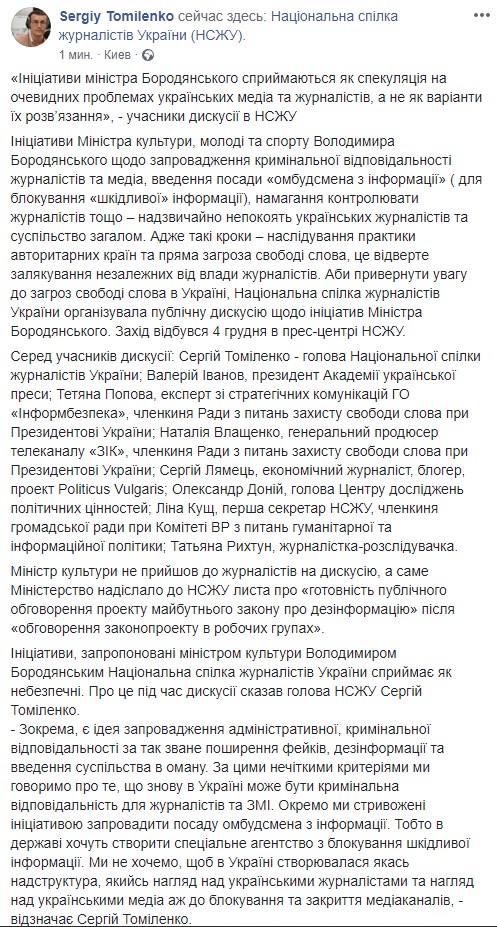 По словам Томиленко, инициативы, предложенные министром культуры Владимиром Бородянским Национальный союз журналистов Украины воспринимает как опасные.