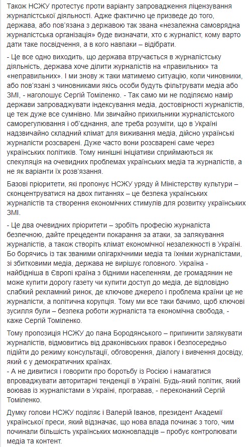 Также НСЖУ протестует против варианта введения лицензирования журналистской деятельности. Ведь фактически это приведет к тому, что государство, или связана с государством так называемая "независимая самоуправляемая журналистская организация" будет определять, кто есть журналист, кому стоит дать такое удостоверение, а у кого наоборот – отобрать.