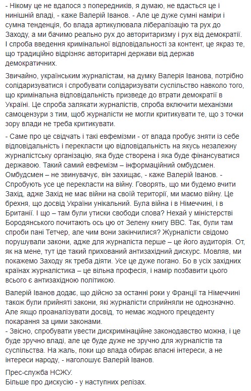 НСЖУ призвал Бородянского прекратить запугивать журналистов, отказаться от драконовских поправок и непосредственно подойти к режиму консультации, обсуждения, диалога и изучения опыта, который есть в демократических странах.