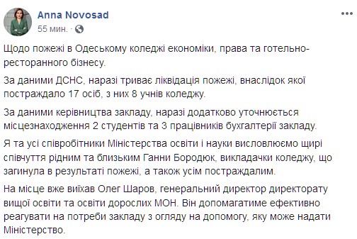 "Относительно пожара в Одесском колледже экономики, права и гостинично-ресторанного бизнеса. По данным ГСЧС, сейчас продолжается ликвидация пожара, в результате которого пострадало 17 человек, из них 8 учащихся колледжа. По данным руководства заведения, в настоящее время дополнительно уточняется местонахождение студентов 2 и 3 работников бухгалтерии учреждения", - сказала она.