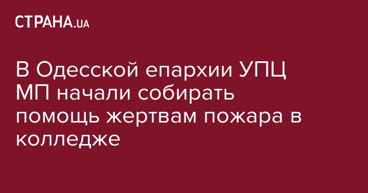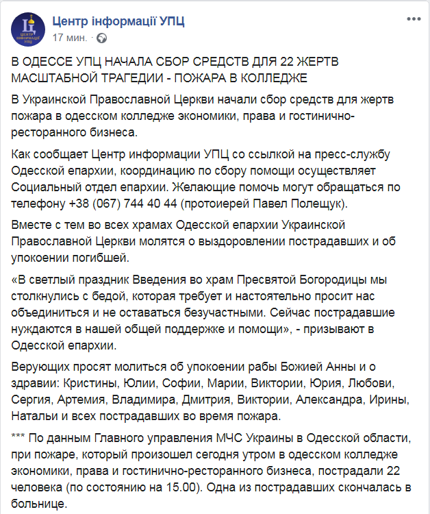 Украинская православная церковь открыла сбор средств для жертв пожара в одесском колледже экономики, права и гостинично-ресторанного бизнеса, который случился 4 декабря. Об этом говорится в Facebook-аккаунте Центра информации УПЦ.