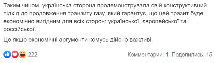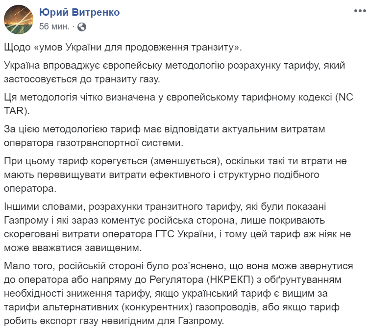 "По этой методологии тариф должен соответствовать актуальным расходам оператора газотранспортной системы. Иными словами, расчеты транзитного тарифа, которые были показаны "Газпрому" и которые сейчас комментирует российская сторона, только покрывают скорректированные расходы оператора ГТС Украины, и поэтому этот тариф никак не может считаться завышенным", - говорится в опубликованном сообщении.