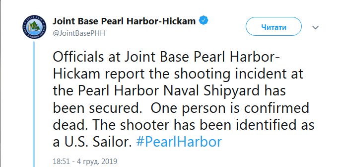"Официальные лица объединенной базы Перл-Харбор-Хикам сообщают, что инцидент со стрельбой на военно-морской верфи в Перл-Харборе был ликвидирован. Один человек найден мертвым. Стрелок был идентифицирован как моряк США", - заявили военные.