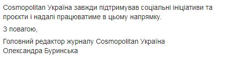 "Бренд Cosmopolitan безоговорочно находится на стороне своего народа в борьбе за сохранение независимости и суверенитета, выражает поддержку героям, которые защищают Украину, и уважает светлую память погибших, отдавших свою жизнь за наше мирное будущее", – отметила главный редактор журнала Александра Буринская.