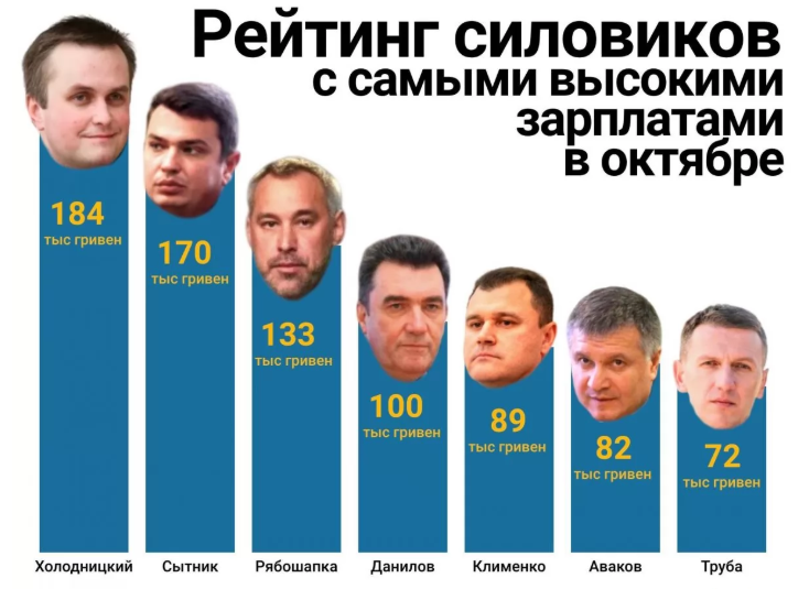 Следом за генпрокурором в рейтинге следует глава СНБО Алексей Данилов. Сумма его заработной платы составила 100 230 гривен. Об этом сообщалось в официальном ответе СНБО. Согласно полученным данным, его оклад составляет 18 тыс. гривен, а в зарплату также включены премия (54 тыс. гривен), надбавка за интенсивность труда (17 600 гривен), а также некоторые другие надбавки (общей суммой 11 тысяч гривен).