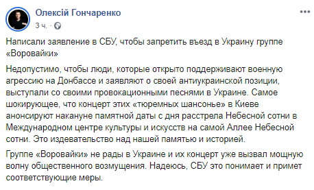 "Недопустимо, чтобы люди, которые открыто поддерживают военную агрессию на Донбассе и заявляют о своей антиукраинской позиции, выступали со своими провокационными песнями в Украине. Самое шокирующее, что концерт этих "тюремных шансонье" в Киеве анонсируют накануне памятной даты с дня расстрела Небесной сотни", – говорится тексте.