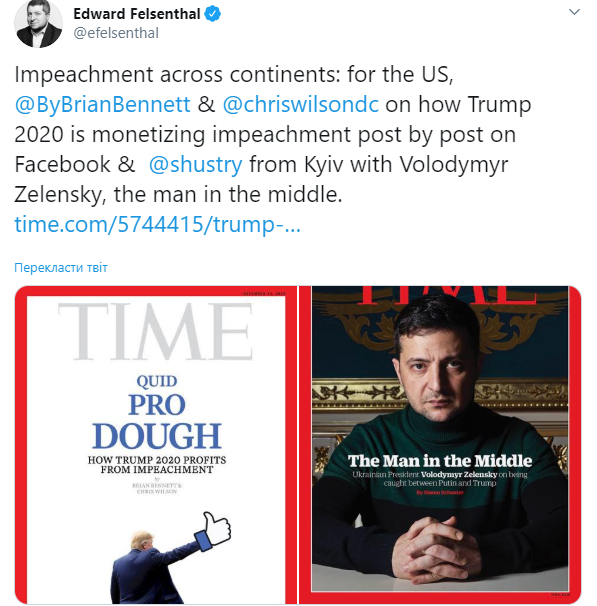 В свежем номере будет опубликована статья под названием "Человек в центре" (The Man in the Middle). В ней пойдет речь о том, что американские демократы считают Владимира Зеленского жертвой превышения полномочий президента США Дональда Трампа. Поэтому американскому лидеру грозит импичмент. Но вместе с тем республиканцы рассматривают Зеленского как ключевого свидетеля доказательств невиновности Трампа.