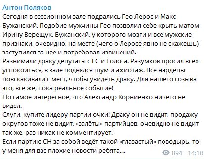 Лерос подтвердил факт драки. "Да, подрались с Бужанским, разошлись во взглядах. Из-за чего произошел инцидент, не считаю нужным комментировать, так как мы в одной фракции", - написал он в Facebook.