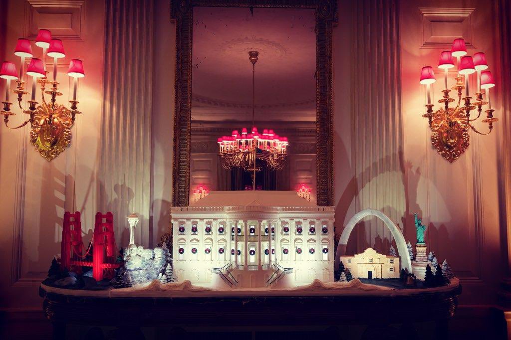 Главную рождественскую ель резиденции президента США в этом году украсили бумажными цветами ручной работы. Они являются эмблемами каждого штата. А в Парадной столовой установили имбирный домик с копиями главных достопримечательностей страны: статуи Свободы, моста Золотые Ворота, горы Рашмор и других.