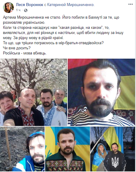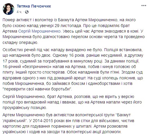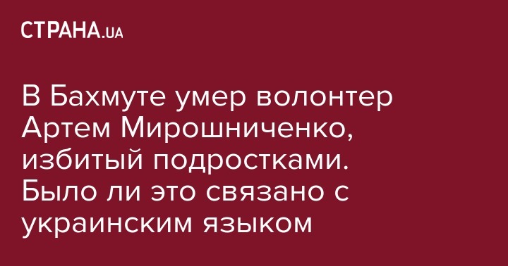 5 декабря в Бахмуте Донецкой области после избиения скончался 38-летний волонтер Артем Мирошниченко. На него напали на улице 29 ноября, все это время он находился в коме. Полиция задержала двух нападавших, им оказалось по 16 и 17 лет. В сети пишут, что поводом могло стать то, что Артем говорил на украинском языке.