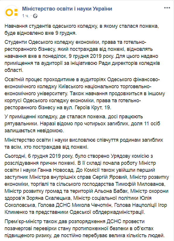 Кроме того, сегодня была создана правительственная комиссия по расследованию причин пожара, в состав которой вошла министр образования и науки Анна Новосад.