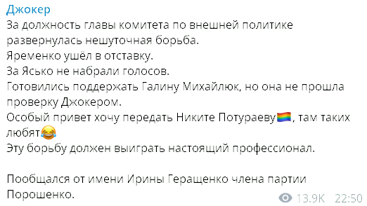 "За должность главы комитета по внешней политике развернулась нешуточная борьба. Яременко ушел в отставку. За Ясько не набрали голосов. Готовились поддержать Галину Михайлюк, но она не прошла проверку Джокером. Особый привет хочу передать Никите Потураеву, там таких любят. Эту борьбу должен выиграть настоящий профессионал", - написал пранкер.