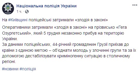 Сотрудники правоохранительных органов под Киевом задержала "вора в законе" по прозвищу "Гега Озургетский", который незаконно прибыл на территорию Украины 5 декабря. Об этом сообщает пресс-служба полиции в Facebook.
