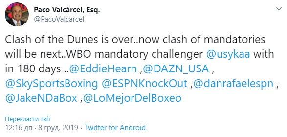 Об этом написал президент WBO Пако Валькарсель в Твиттере.