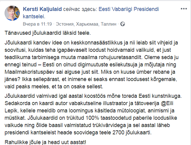 Президент Эстонии Керсти Кальюлайд в канун католического Рождества подписала 2700 открыток с поздравлениями на эстонском, английском, русском, французском и немецком языках. Об этом она сообщила в своем Faceboоk.