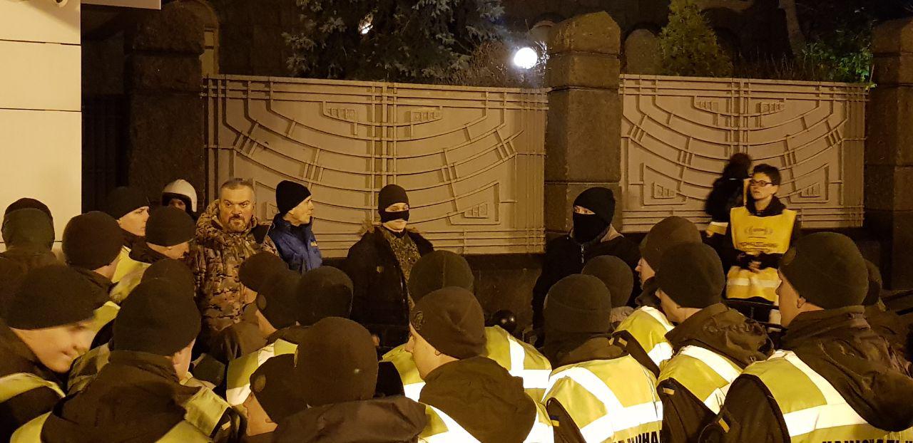 23:35 У здания Офиса президента на Банковой продолжается акция "Варта на Банковой" с требованием к Владимиру Зеленскому не допустить сдачи национальных интересов государства во время переговоров "Нормандском формате" в Париже в понедельник.