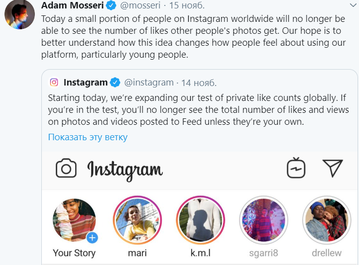 "Скрывая лайки, мы действительно хотим убрать лишнее давление на молодежь. Скорее всего, нововведение повлияет на поведение пользователей Instagram: возможно, уменьшится количество лайков, увеличится количество постов. Главная наша цель - исследовать, как эти изменения повлияют на чувства людей", - заявил Моссера.