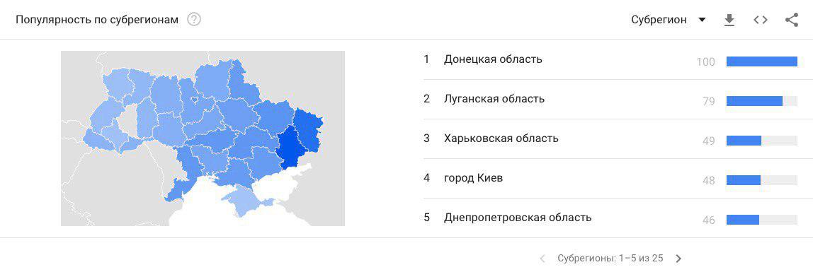 На скрине с Google Trends, где отслеживаются поисковые запросы украинцев, видно, что наиболее активно новости из Парижа по запросу "Нормандская встреча" прямо сейчас ищут в таких регионах Украины, в порядке убывания: Донецкая область, Луганская область, Харьковская область, Киев, Днепропетровская область.