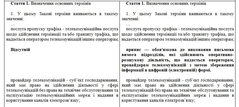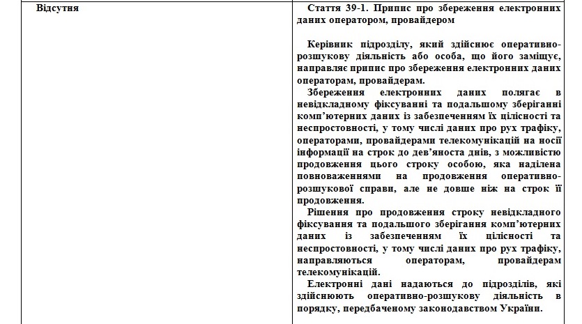 Как сообщается, представитель Национальной полиции Украины в рабочей группе предлагал в основные термины законопроекта ввести понятие "предписание" как "обязательное к исполнению письменное требование подразделений, осуществляющих оперативно-розыскную деятельность, которое предоставляется операторам, провайдерам телекоммуникаций с целью сохранения информации в цифровой (электронной) форме".