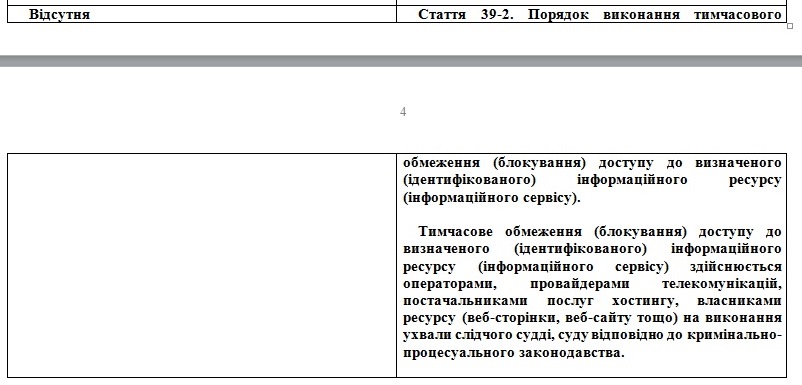 Кроме того, согласно документам, в полиции также хотят ввести статью о блокировке сайтов. Предлагаемая статья с названием "Порядок выполнения временного ограничения (блокировки) доступа к определенному (идентифицированному) информационному ресурсу (информационному сервису" предполагает, что временное ограничение (блокировка) доступа к определенному (идентифицированному) информационному ресурсу (информационному сервису) "осуществляется операторами, провайдерами телекоммуникаций, поставщиками услуг хостинга, владельцами ресурса (веб-страницы, веб-сайта и т.д.) во исполнение постановления следственного судьи, суда в соответствии с уголовно-процессуальным законодательством".