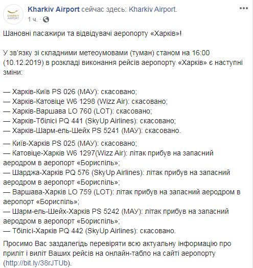 Международный аэропорт "Харьков" (МАХ) во вторник отменяет рейсы из-за сложных метеоусловий (весь день в городе сильный туман).