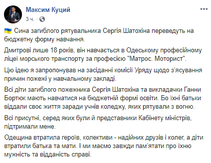 "Дмитрию всего 18 лет, он учится в Одесском профессиональном лицее морского транспорта по профессии "Матрос. Моторист"… Все дети погибшего пожарного Сергея Шатохина и преподавательницы Анны Бортюк должны учиться на бюджетной форме образования. Потому что их родители отдали свою жизнь ради учащихся колледжа, которых они спасали из огня", - написал Куцый в соцсети.
