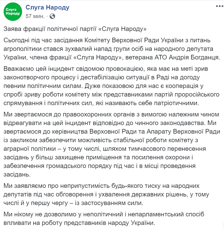 "Считаем этот инцидент сознательной провокацией, которая имеет целью срыв законотворческого процесса и дестабилизацию ситуации в Раде в угоду определенным политическим силам. Очень показательной для нас является кооперация в попытке срыва работы комитета между представителями партий пророссийского толка и политических сил, которые называют себя патриотическими. Мы обращаемся к правоохранительным органам с требованием должным образом отреагировать на этот инцидент в соответствии с действующим законодательством. Мы обращаемся к руководству Верховной Рады и Аппарата Верховной Рады с призывом обеспечить возможность стабильной работы комитета по аграрной политике – в том числе путем временного переноса заседаний в более защищенное помещение и усиления охраны и обеспечения общественного порядка во время и в месте проведения заседаний", - отмечается в опубликованном заявлении.