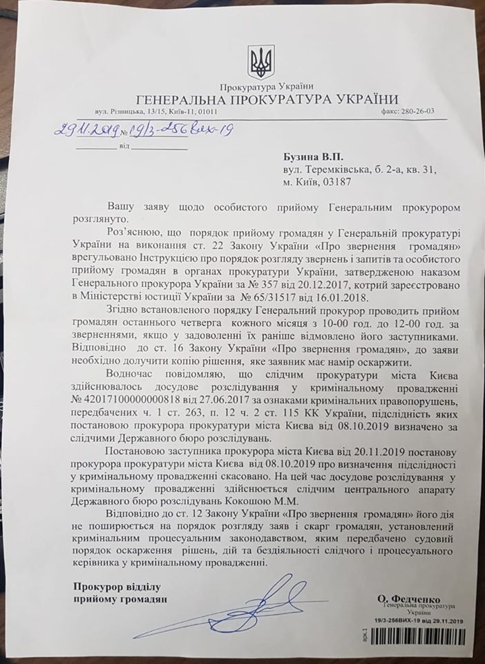 "В ответ на свое обращение к генпрокурору Валентина Павловна Бузина получила отписку прокурорского клерка, в котором ей разъяснили порядок приема генпрокурором. При этом Рябошапка сделал вид, что "забыл", что дело об убийстве О. Бузины давно попало в международные отчеты по правам человека ОБСЕ, мониторинговой миссии ООН, Госдепартамента США как один из примеров нападений на журналистов и грубейших нарушений прав человека в Украине", - говорится в сообщении.
