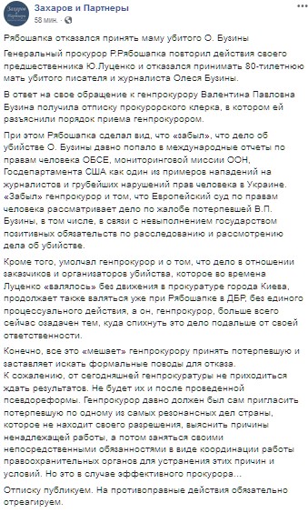 Генеральный прокурор Руслан Рябошапка отказался принять 80-летнюю мать убитого писателя и журналиста Олеся Бузины. Об этом говорится на странице "Захаров и Партнеры" в Facebook.