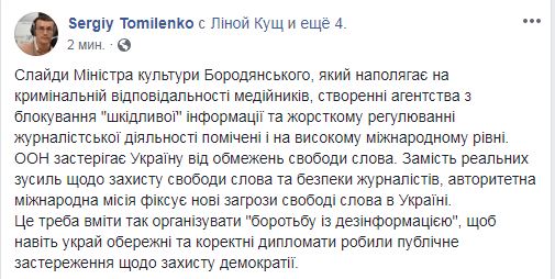"ООН предостерегает Украину от ограничений свободы слова. Вместо реальных усилий по защите свободы слова и безопасности журналистов, авторитетная международная миссия фиксирует новые угрозы свободе слова в Украине. Это надо уметь так организовать "борьбу с дезинформацией", чтобы даже крайне осторожные и корректные дипломаты делали публичное предостережение по защите демократии", - пишет Томиленко.