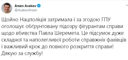 Глава МВД Арсен Аваков написал, что Нацполиция задержала и с согласия ГПУ объявляет обоснованные подозрения фигурантам дела об убийстве Павла Шеремета.