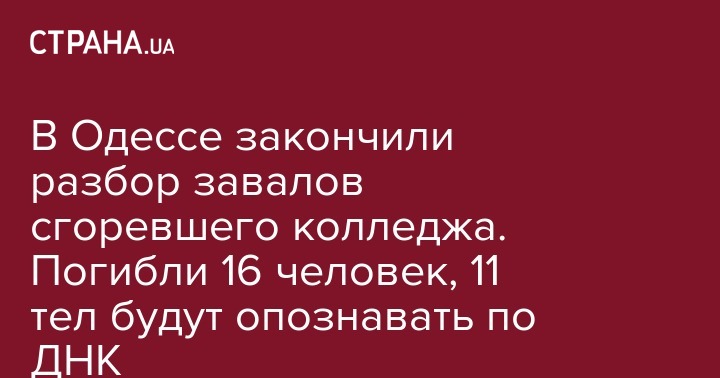 Из 14 тел, найденных в руинах колледжа, опознаны лишь четверо, сообщил глава следственного управления ГУНП в Одесской области Сергей Шайхет. По его словам, идентификация одного из тел вызывает сомнения, поэтому будет проведено еще 11 генетических экспертиз. Это должны сделать в течение 14 дней, передает "Думская".