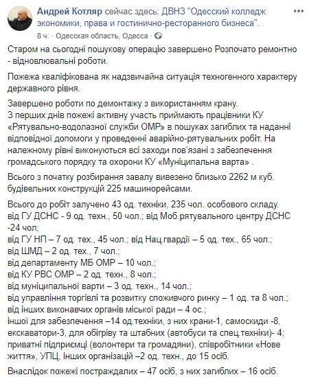 В четверг, 12 декабря, спасатели завершили поисковую операцию в сгоревшем здании Одесского колледжа экономики, права и гостинично-ресторанного бизнеса. Об этом на своей странице в соцсети сообщил заместитель городского головы Одессы Андрей Котляр.