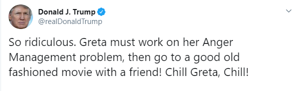 "Так нелепо. Грета должна научиться справляться со своим гневом, а потом пойти на хорошее старое кино с другом! Расслабься, Грета, расслабься!", - написал Трамп в своем Тwitter.