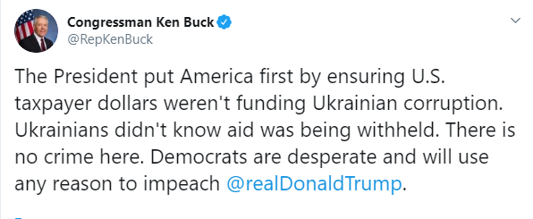 Президент США Дональд Трамп репостнул твит конгрессмена-республиканца Кена Бака, в котором тот объясняет, почему американский лидер задерживал помощь Украине.