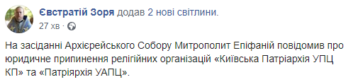 Об этом сообщил замглавы Управления внешних церковных связей Евстратий Зоря в Facebook.